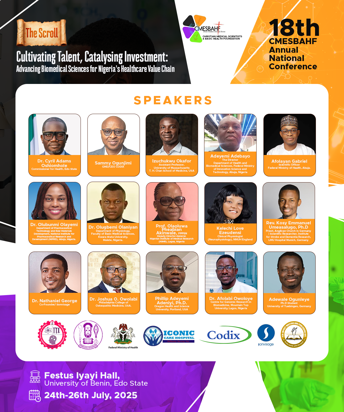 The Christian Medical Scientists and Basic Health Foundation (CMESBAHF) proudly presents its 2025 National Conference, aimed at fostering innovation, collaboration, and knowledge exchange in biomedical sciences. This conference serves as a platform to bridge the gap between laboratory discoveries and clinical applications in the Nigerian healthcare landscape. The CMESBAHF 2025 National Conference, "Cultivating Talent, Catalyzing Investment: Advancing Biomedical Sciences for Nigeria's Healthcare Value Chain" addresses two critical challenges facing Nigeria's biomedical sector: the need for skilled human resources and sustainable funding for research and innovation.